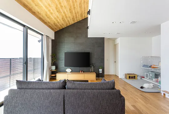 家族も猫も開放感いっぱいに寛げる、吹抜け勾配天井がある平屋の住まい。