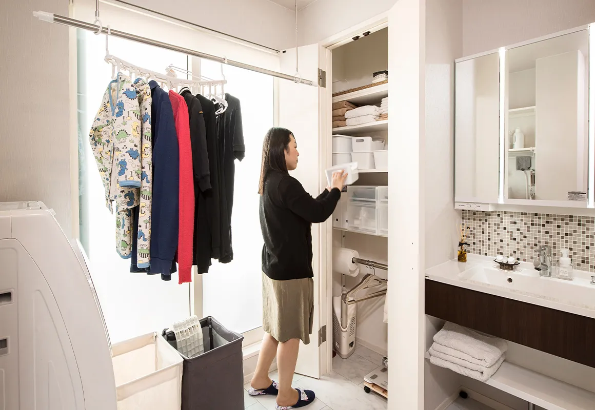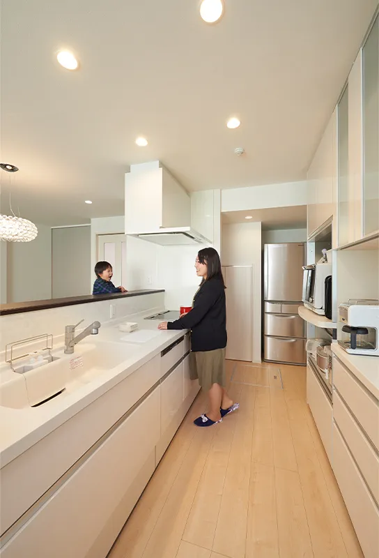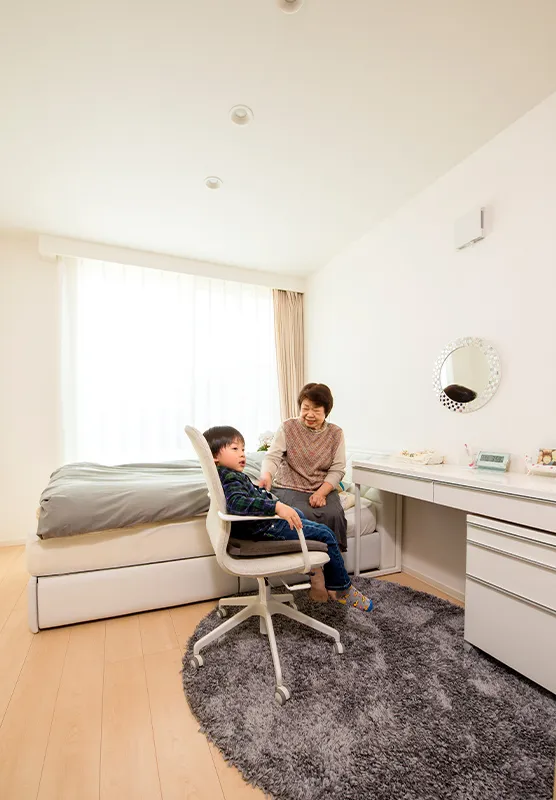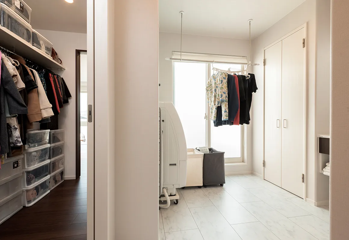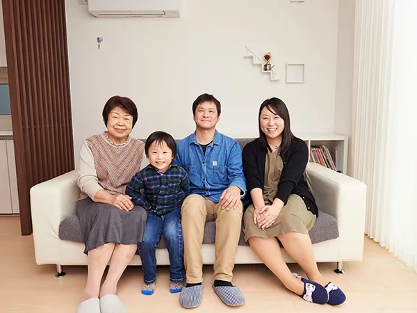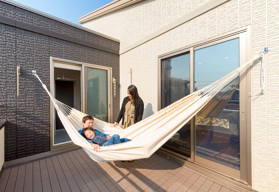 N様ご夫婦のこだわりは、家族に加え、ご夫婦の兄弟家族も集まれる大きな空間をつくること。そして、生活時間帯が異なるお母様と気兼ねなく暮らせることでした。そこで、1階に大空間のLDKとお母様の部屋、来客用の和室を配置。2階をN様世帯の居室と浴室などの水まわりにすることに。「広いLDKのおかげで、みんなで過ごす時間が長くなりました。母の部屋がLDKの隣なので、料理中などすぐに子どもを見に来てくれます。洗面・浴室は2階なので、夜勤がある主人も気兼ねなく生活できますし、主寝室からクローゼット、洗面室、バルコニーへつながる洗濯動線もコンパクト。ストレスがなく、家事が楽しい家です」(奥様)。このほか、寝室にお2人それぞれの書斎、バーカウンターを設けたり、リビングやバルコニーにハンモックを吊るせるようにしたり、太陽光発電を搭載して光熱費負担を軽減したり。「わがままを全部詰め込んでもらいました」と、幸せな笑顔を見せてくださったN様ご家族でした。