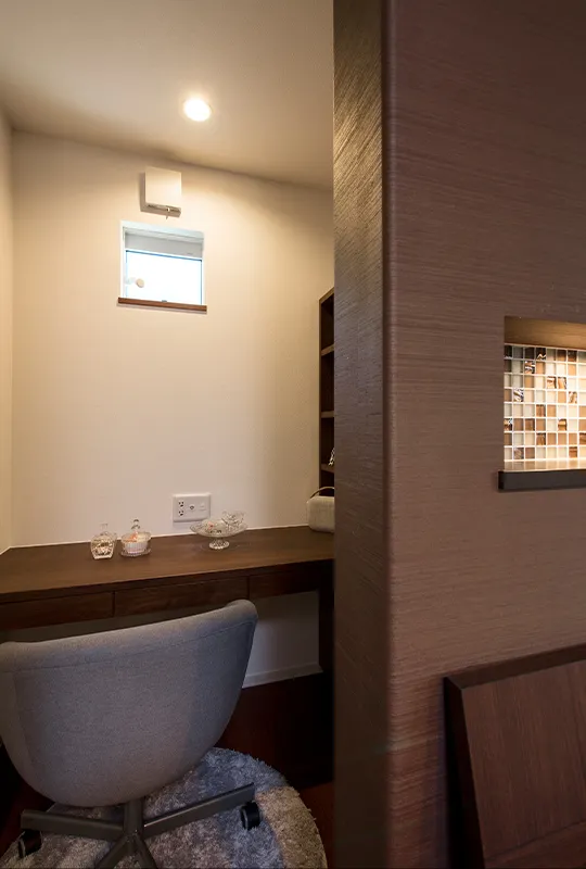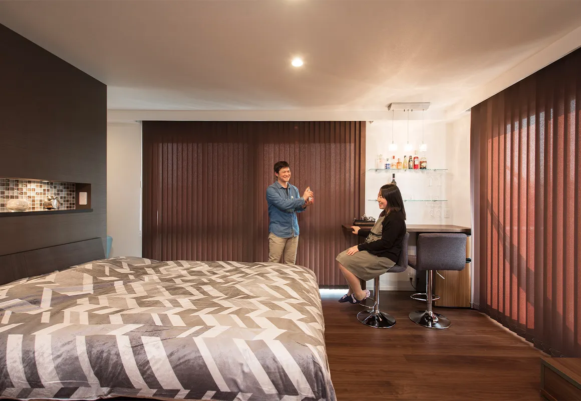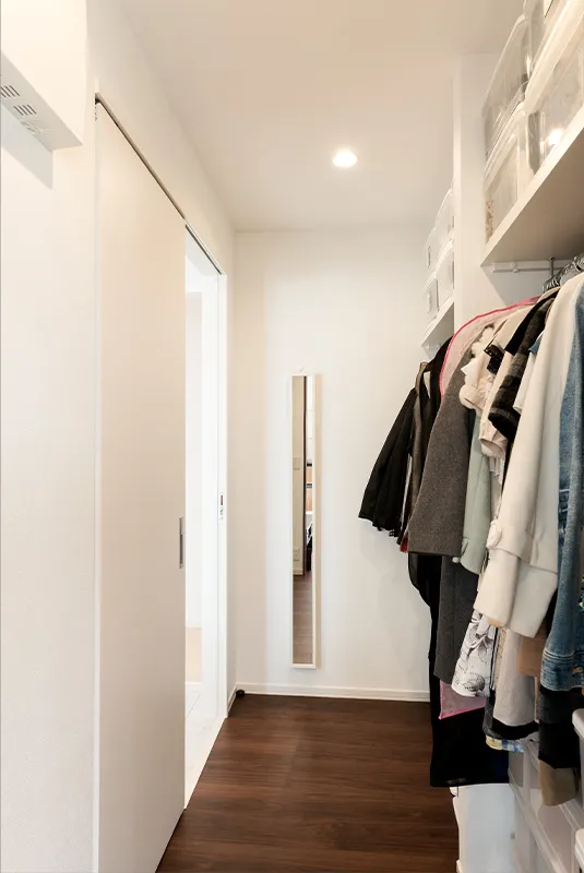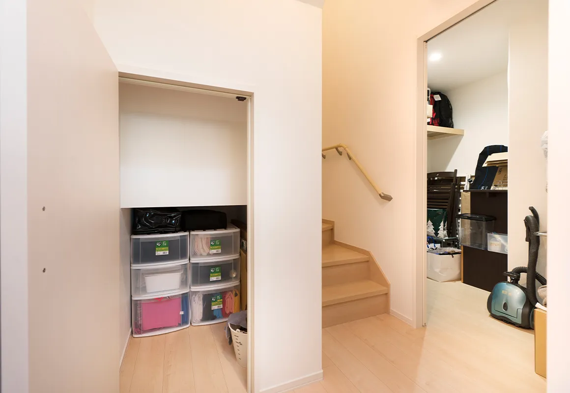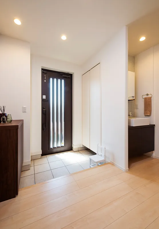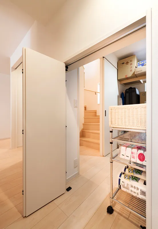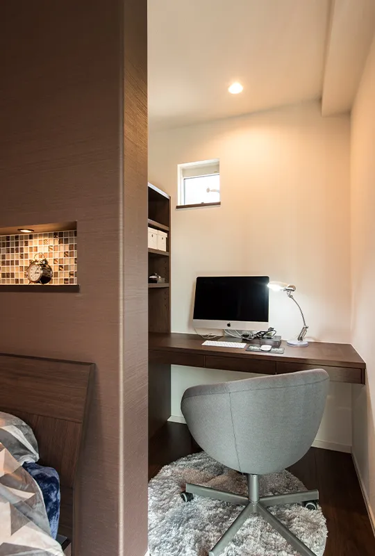 N様ご夫婦のこだわりは、家族に加え、ご夫婦の兄弟家族も集まれる大きな空間をつくること。そして、生活時間帯が異なるお母様と気兼ねなく暮らせることでした。そこで、1階に大空間のLDKとお母様の部屋、来客用の和室を配置。2階をN様世帯の居室と浴室などの水まわりにすることに。「広いLDKのおかげで、みんなで過ごす時間が長くなりました。母の部屋がLDKの隣なので、料理中などすぐに子どもを見に来てくれます。洗面・浴室は2階なので、夜勤がある主人も気兼ねなく生活できますし、主寝室からクローゼット、洗面室、バルコニーへつながる洗濯動線もコンパクト。ストレスがなく、家事が楽しい家です」(奥様)。このほか、寝室にお2人それぞれの書斎、バーカウンターを設けたり、リビングやバルコニーにハンモックを吊るせるようにしたり、太陽光発電を搭載して光熱費負担を軽減したり。「わがままを全部詰め込んでもらいました」と、幸せな笑顔を見せてくださったN様ご家族でした。