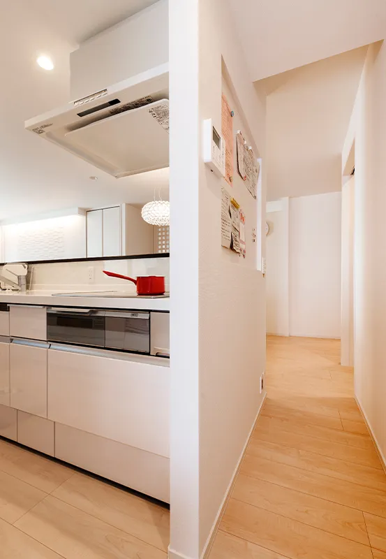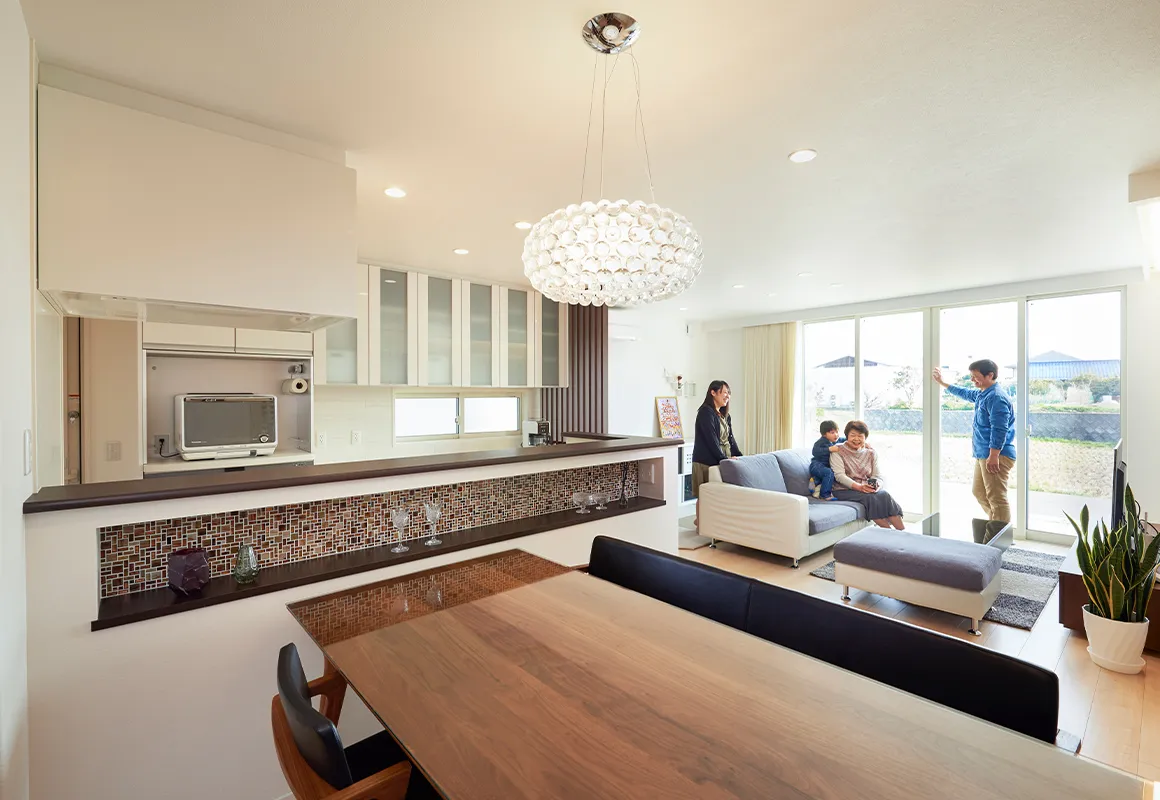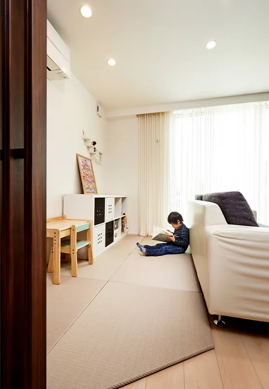 ハイサッシを採用し、明るく開放的な雰囲気のリビング。テレビの背面に張ったエコカラットは、デザイン上のアクセントになっているほか、オープンキッチンからの匂い対策も兼ねています。照明は、ダウンライトと間接照明で上質な雰囲気を演出。大きな窓の外にはステップを設け、庭から直接出入りすることも可能に。「買い物帰りで荷物が多いときや、遊んでいる子どもを見守るときにいいかなと思っています」(奥様)。さらにリビングの一角には、畳店を営んでいる奥さまのお父様お手製の置き畳で、お子様用のコーナーを用意。お子様は、やわらかい畳に寝そべりながら、本を読んだりお絵かきしたりしています。