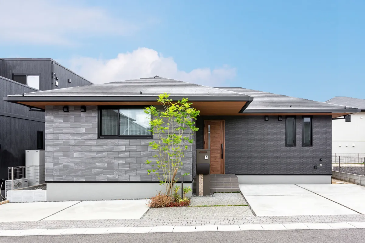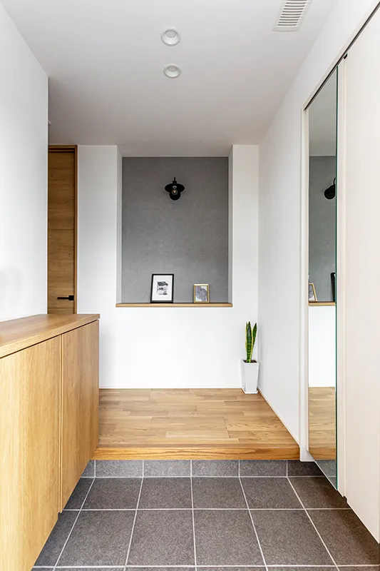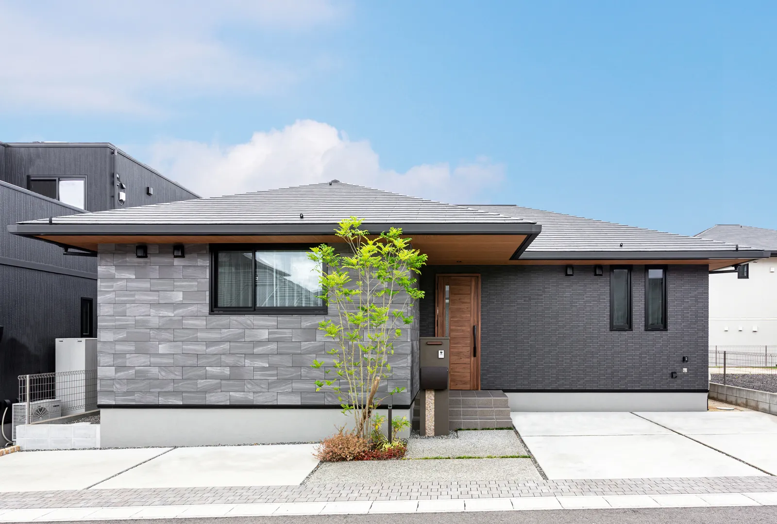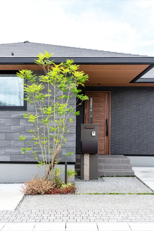 整った街並みの分譲地内で、総タイル張りの重厚感あふれる外観が目を惹くK様邸。グレーで統一した落ち着きのある佇まいでありながら、2種類のタイルをシルエットに合わせて張り分け、変化をもたせています。質感高い外壁タイルに植栽の緑が色鮮やかに引き立ち、迎え入れる家族やゲストの気分を高めます。また、ゆったりと架かる寄棟屋根がおおらかな印象をもたらし、軒天や玄関ドアの木目柄と調和。玄関アプローチに沿って軒が深く張り出すことで、軒先の水平ラインを強調すると同時に、アプローチを雨や日差しから守る効果も期待できます。