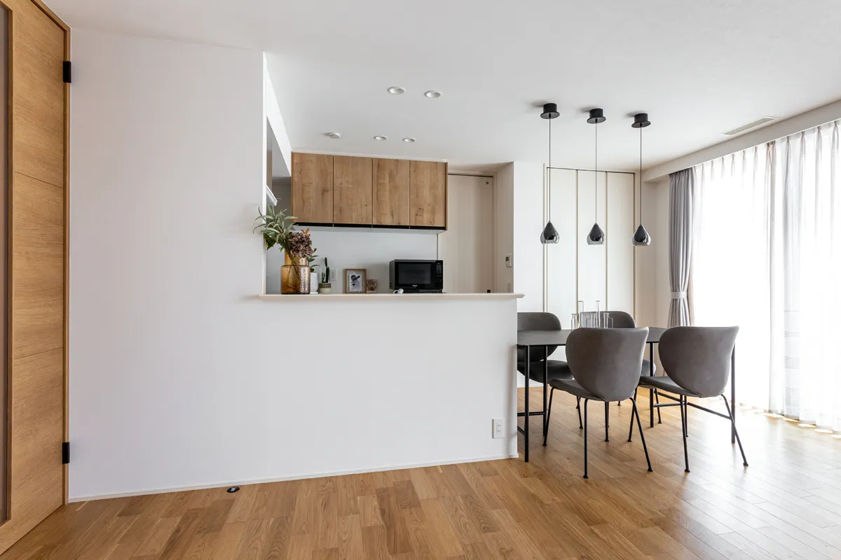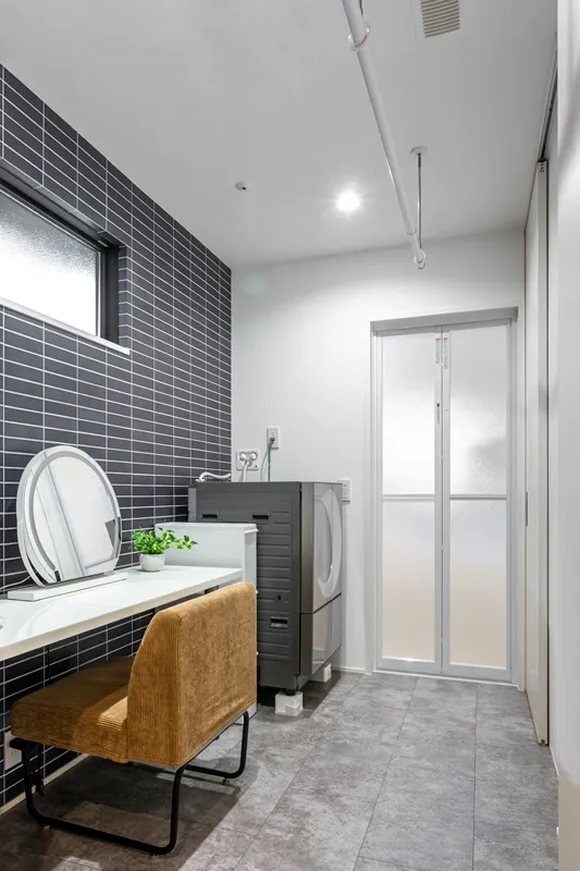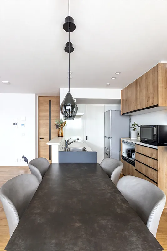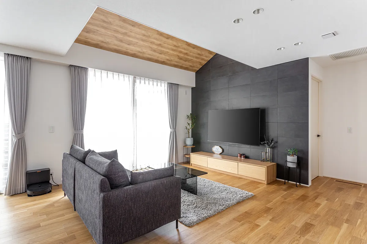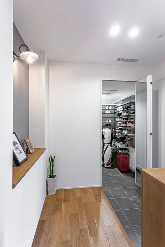 整った街並みの分譲地内で、総タイル張りの重厚感あふれる外観が目を惹くK様邸。グレーで統一した落ち着きのある佇まいでありながら、2種類のタイルをシルエットに合わせて張り分け、変化をもたせています。質感高い外壁タイルに植栽の緑が色鮮やかに引き立ち、迎え入れる家族やゲストの気分を高めます。また、ゆったりと架かる寄棟屋根がおおらかな印象をもたらし、軒天や玄関ドアの木目柄と調和。玄関アプローチに沿って軒が深く張り出すことで、軒先の水平ラインを強調すると同時に、アプローチを雨や日差しから守る効果も期待できます。