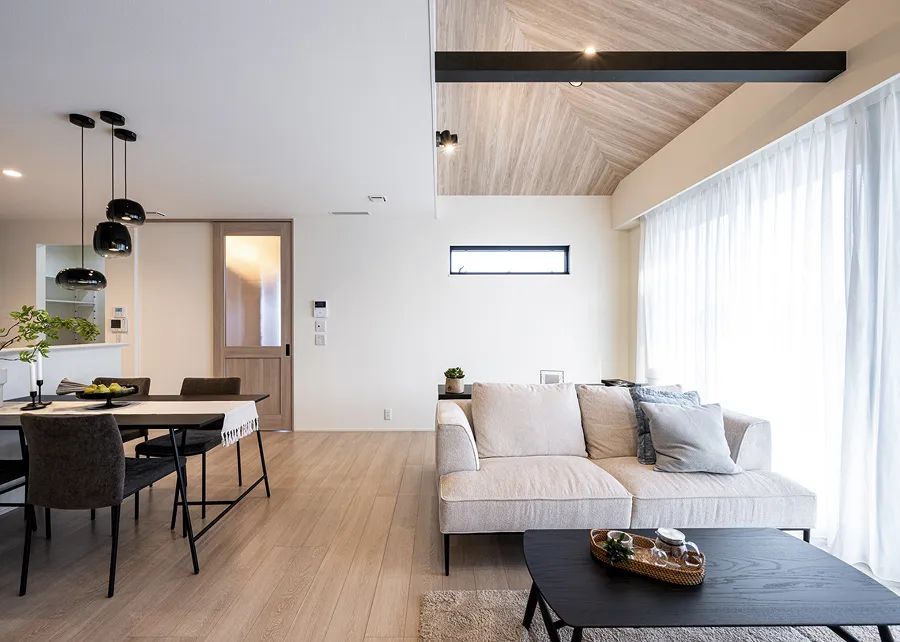 勾配天井を活かした木目調のおしゃれな吹抜と大開口で開放感あるLDK