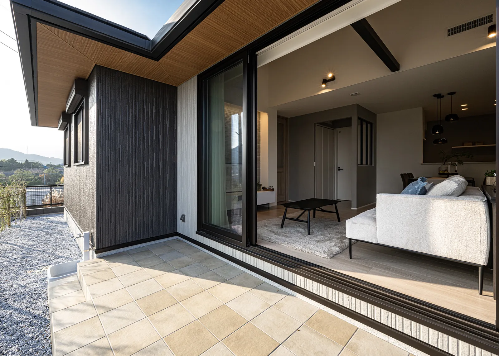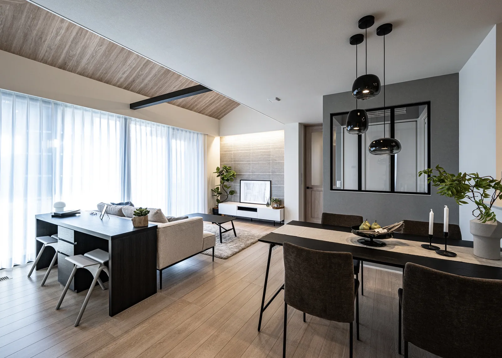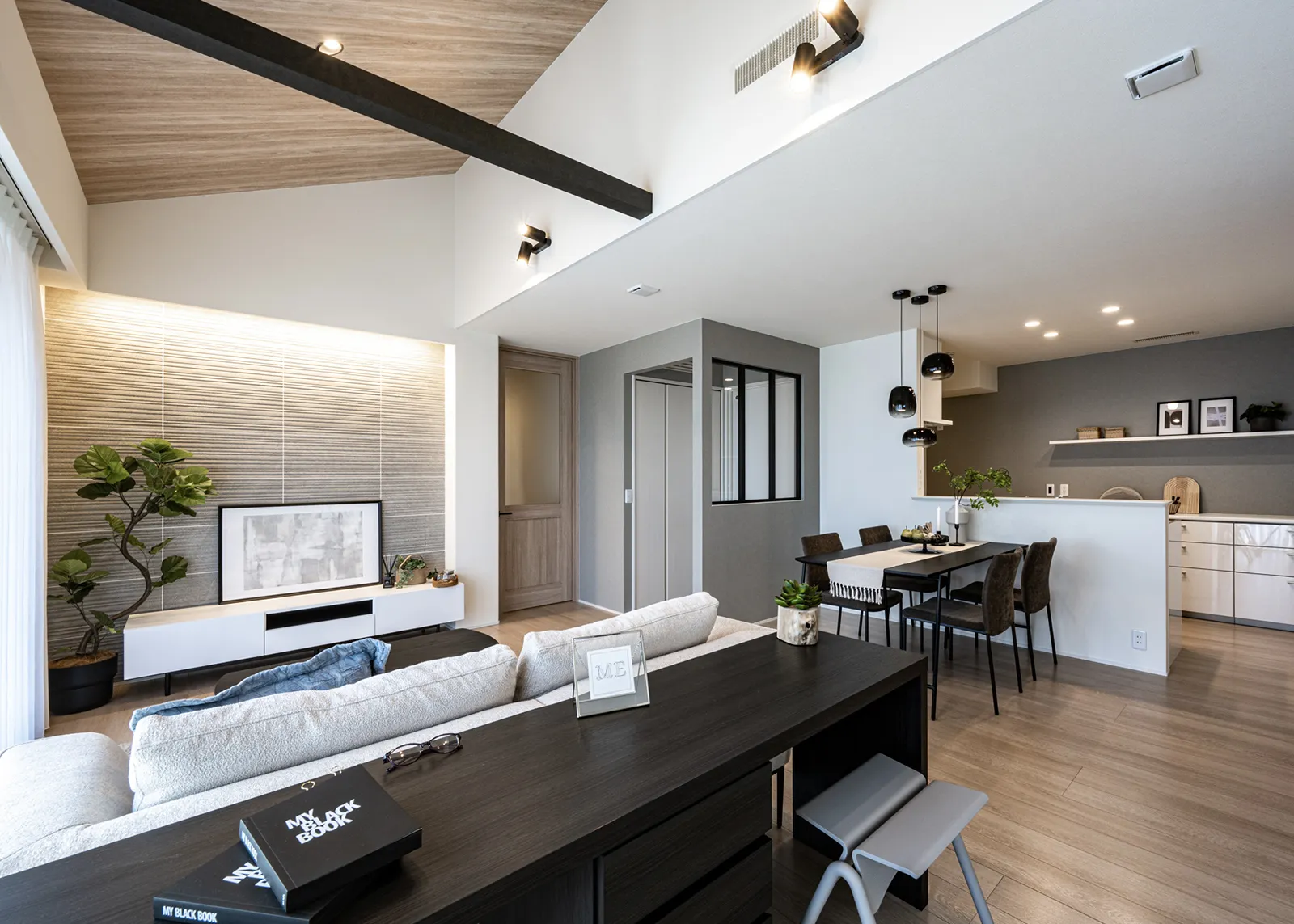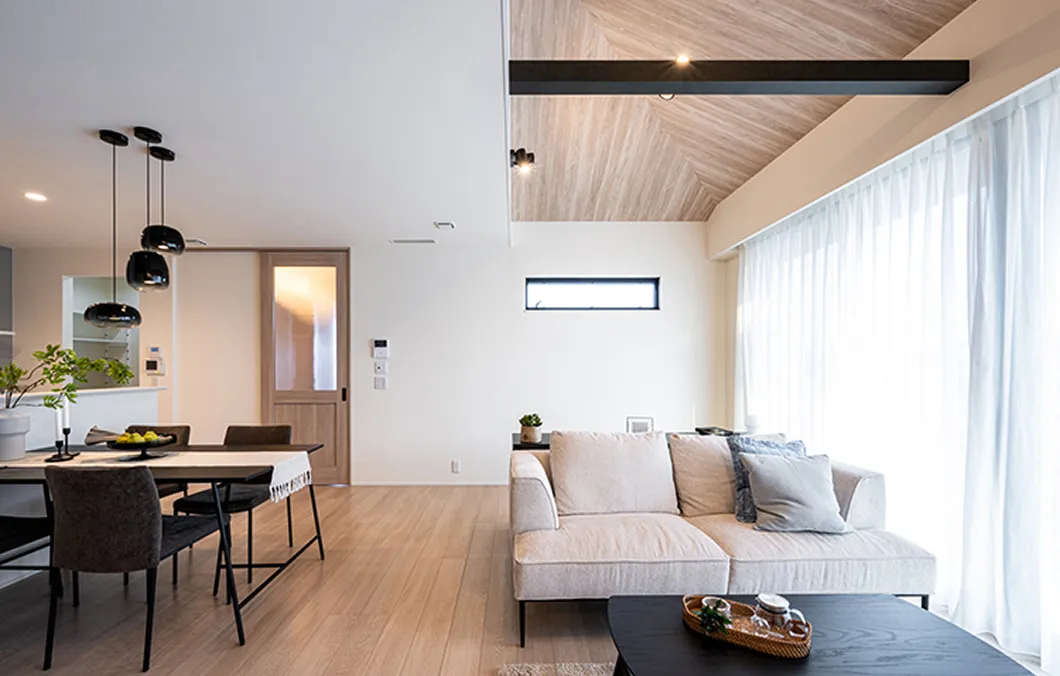勾配天井を活かした木目調のおしゃれな吹抜と大開口で開放感あるLDK。