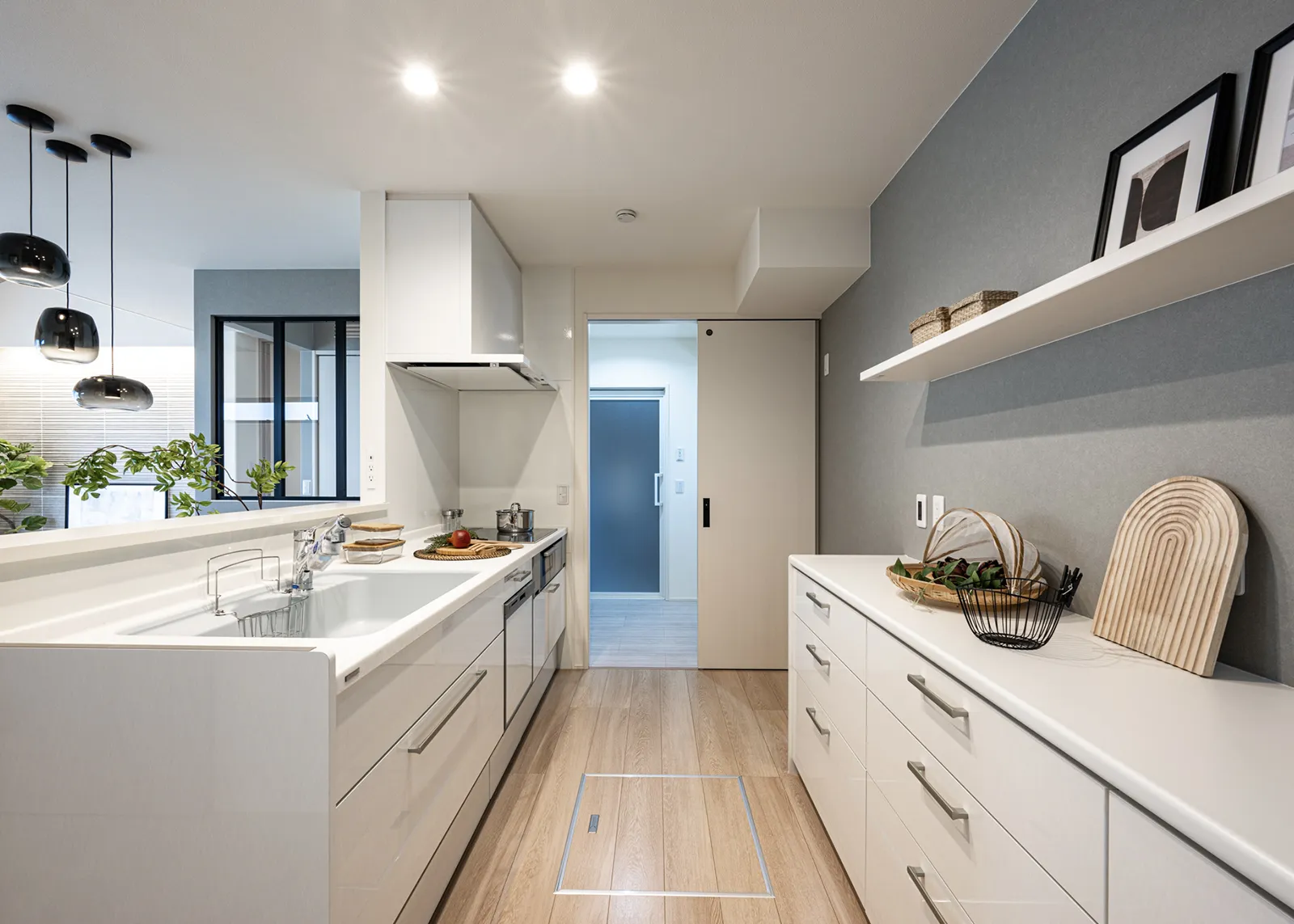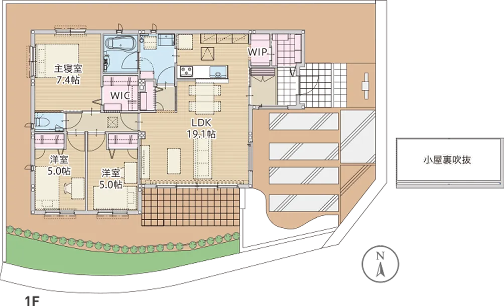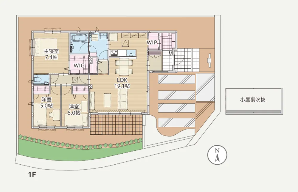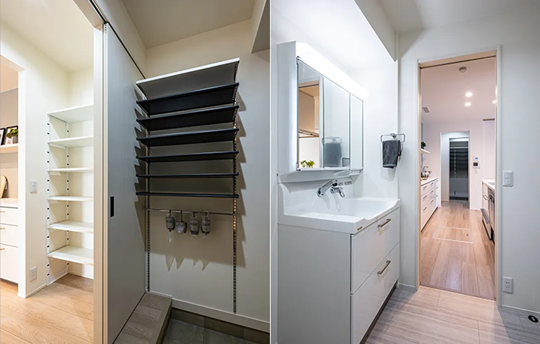 玄関→WIP→キッチン→洗面室が直結。機能的な家事導線を確保。