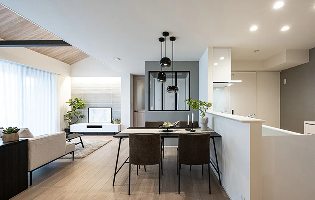ダイニングテーブル横のインテリアウインドウは、洗面室と収納を目隠ししながらも開放感を演出。
